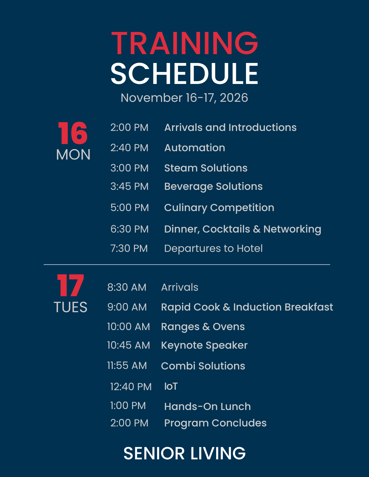 This immersive, hands-on program is designed specifically for foodservice design consultants seeking to deepen their understanding of commercial kitchen equipment and its application within Senior Living foodservice environments. The course provides a comprehensive overview of commonly specified cooking and kitchen systems, including rapid cook solutions, beverage solutions, ventless solutions, baking solutions, combi solutions, steam solutions, and the evolving technologies shaping today’s commercial kitchen environments.