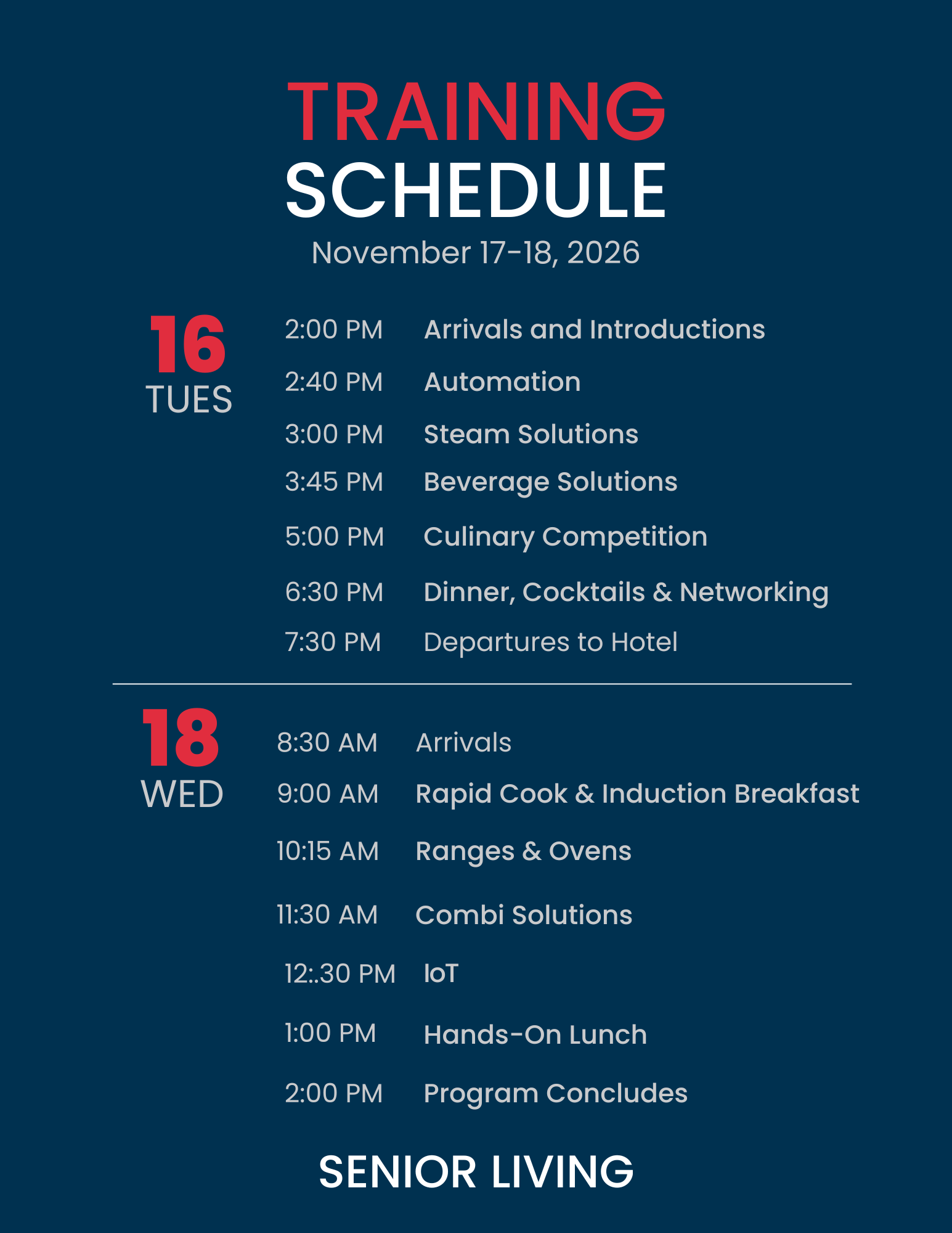 This immersive, hands-on program is designed specifically for foodservice designers and dealers seeking to deepen their understanding of commercial kitchen equipment and its application within Senior Living foodservice environments. The course provides a comprehensive overview of commonly specified cooking and kitchen systems, including rapid cook solutions, beverage solutions, ventless solutions, baking solutions, combi solutions, steam solutions, and the evolving technologies shaping today’s commercial kitchen environments.